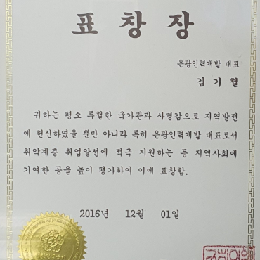 은광인력개발의 김기철 대표가 지역 구직자들에게 양질의 일자리를 제공함으로써 지역사회 발전에 기여한 공로를 인정받아 인천광역시 남구 홍영표 의원님으로부터 표창장을 수여받았습니다.